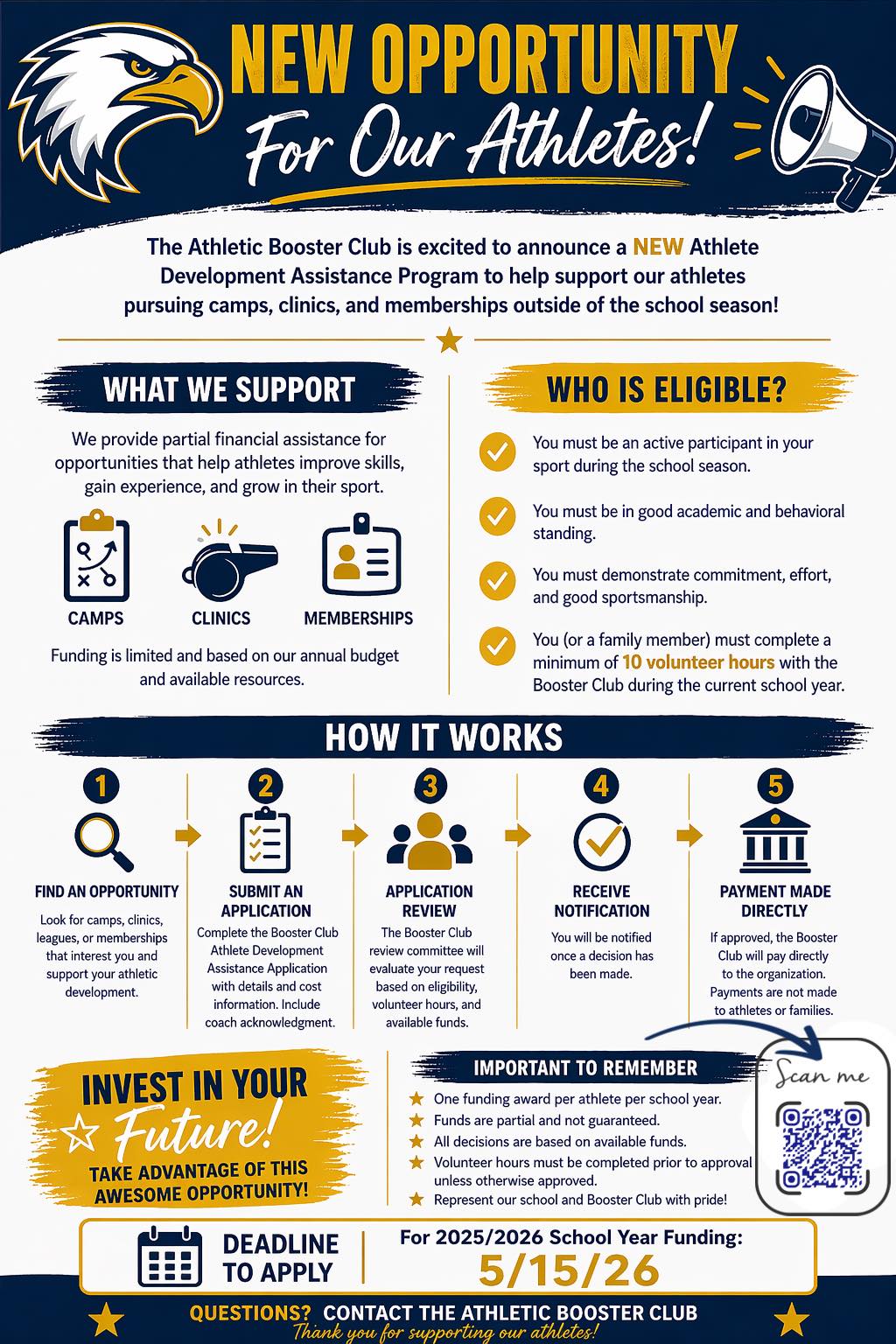The HL Booster Club is excited to announce a new initiative to support athletes financially as they pursue opportunities to improve their skills, gain experience, and grow in their sport. The Athle...