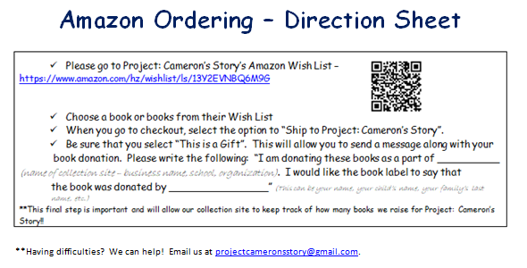 If you would like to donate please follow the directions below. Please make sure to include Hadley-Luzerne School as part of the collection site in your message. Please help HLCS donate books for Project: Cameron's Story!